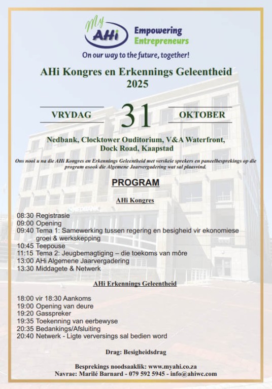 Sluit op 31 Oktober by ons aan in Kaapstad vir ’n inspirerende kongres gevolg deur ’n glansryke toekenningsseremonie wat uitmuntendheid in sake en gasvryheid vier. Toekennings sluit in Sakekamer en Opkomende Sakekamer van die Jaar, sowel as Kleinsake-, Beginner- Gasvryheidsbesigheid en Kleinboer van die Jaar. Moet hierdie hoogtepunt van die jaar nie misloop nie!